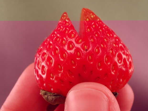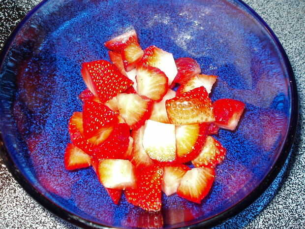 Lo primero que hice fue lavar las fresas y cortarlas en trozos más pequeños para que sea más fácil para mi licuadora.  También corté un pedazo de una de las fresas para hacer un adorno para mi bebida.
