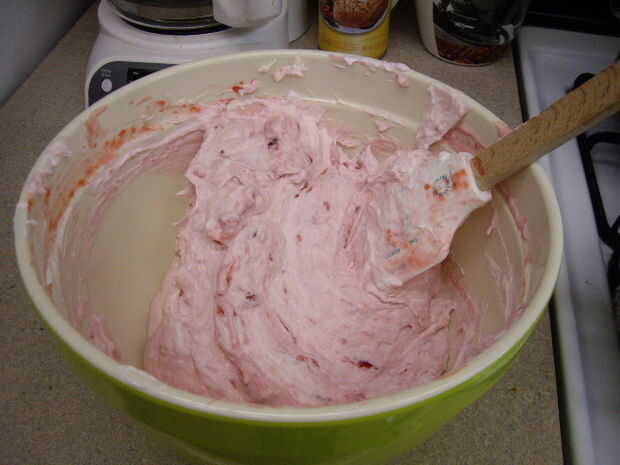 15. doblar la mezcla de fresas a la nata (no lo hacen demasiado o su relleno no sea esponjoso).