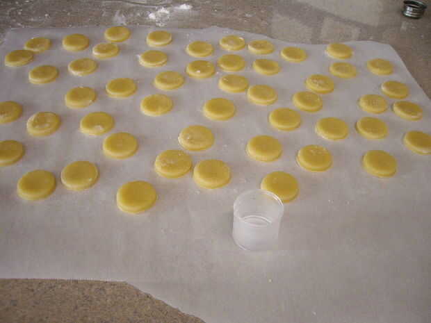 9. Corte el resto de la masa con un cortador de galletas circulares de 1 pulgada. Si no tienes uno de estos, trate de usar una tapa de botella de su perfume favorito (sólo asegúrese de limpiarlo muy bien primero!) o una taza pequeña de pintura. Usted debe cortar tantos círculos como pueda de la masa, pero sólo 25 se ajustan en el pie (otra vez, es bueno tener extras).