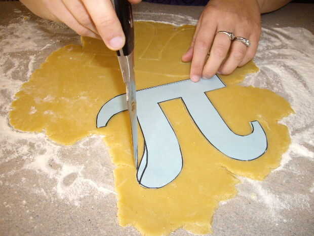 8. Enrolle la masa 1/8 de pulgada de espesor. Cortar con el cortador de galletas favorita pi, o dibujar tu propia pi, córtelo hacia fuera y traza alrededor de él con un cuchillo muy afilado (lo hice en la foto de arriba). Usted quiere hacer tres pi en caso de estar un poco demasiado bruto con ellos después de la cocción...