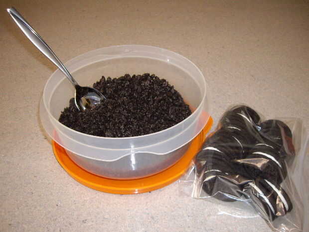 3 tazas de Cream-Filled Sandwiches de galleta de Chocolate, trituradas (ponerlos en una bolsa plástica de cierre cremallera y aplastar con un pan o un perno de balanceo)