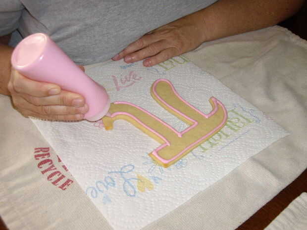 12. hielo las cookies de temperatura usando una manga pastelera y su imaginación. Que el glaseado endurezca completamente entre colores para que no se ejecutarán juntos. Establecer las cookies a un lado hasta que esté listo para montar la tarta.