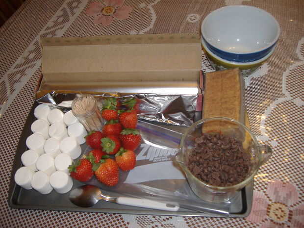 4.) los utensilios son: tamaño de una cuchara, taza, media dos tazones de fuente, un microondas, papel de aluminio, una bolsa ziploc, suficientes palillos para la cantidad de bombones y fresas y una bandeja de galletas grandes.