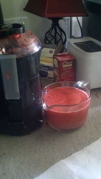 El método de licuadora es mucho más eficiente y eficaz. Si utiliza este método, recomiendo conseguir un paño de muselina, o incluso algunas pantimedias esterilizadas y poner la pulpa en allí. Puede exprimir algunos jugos adicionales de esta manera, y quieres sacarle todo el jugo que puede. Tengo aproximadamente 4 tazas de jugo en el extractor. Filtra el resto de las fresas por un colador y utiliza un recipiente para exprimir el último bit que podría.