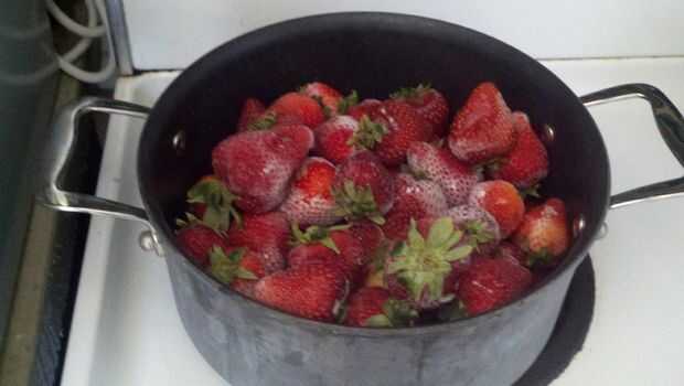 Poner las fresas en una olla y añada 2 tazas de agua. Conjunto a fuego medio alto. No quieres hacerlo hervir, pero desea que calientan. Tiene un machacador o algo similar y empuje hacia abajo las fresas cada par de minutos. No quieres empujar demasiado duro, pero lo suficiente hasta que sienta cierta resistencia de nuevo.