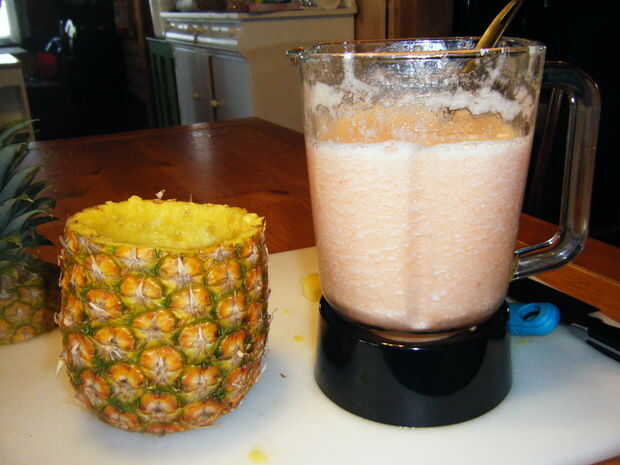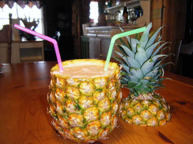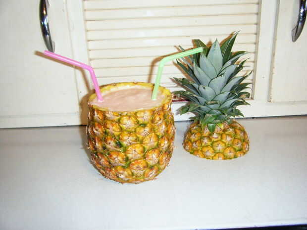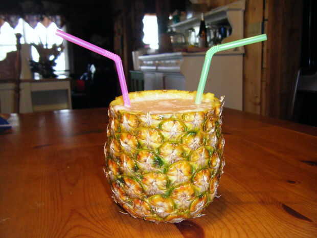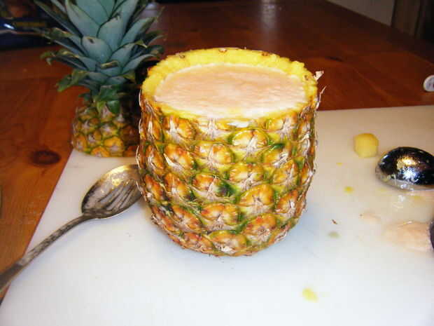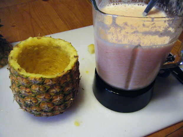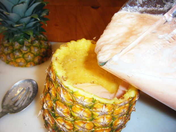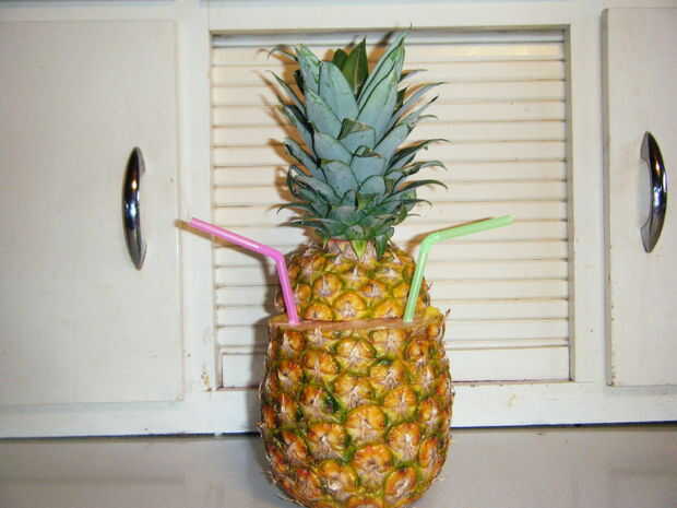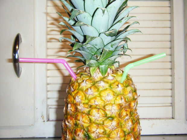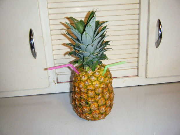 Poner la paja directamente en la piña y colocar la tapa en el borde, o, alternativamente, inserte la paja a través de los agujeros precortados en la parte superior de la piña y la parte superior de la piña encima de la piña (es donde pertenece:).