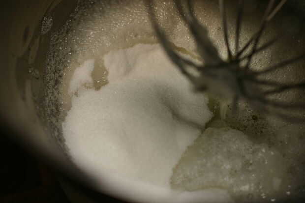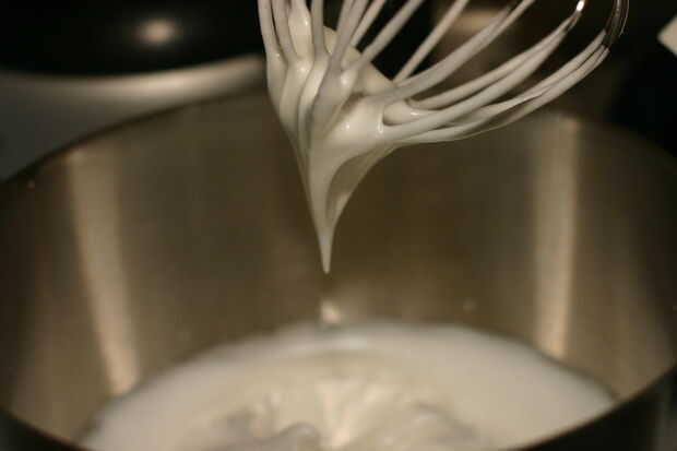 Ahora bata las claras de huevo a velocidad media hasta forthy. Añadir la crema de brea de alquitrán y continuar a batir a velocidad media hasta que las claras de huevo se vuelvan blancos.
