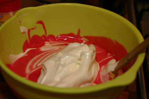 Doble 1/4 de la mezcla de yema en las claras de huevo para aligerar. Luego doblar las claras a la mezcla de yema de huevo, suavemente pero a fondo, tratar de hacer esto tan eficazmente como sea posible.