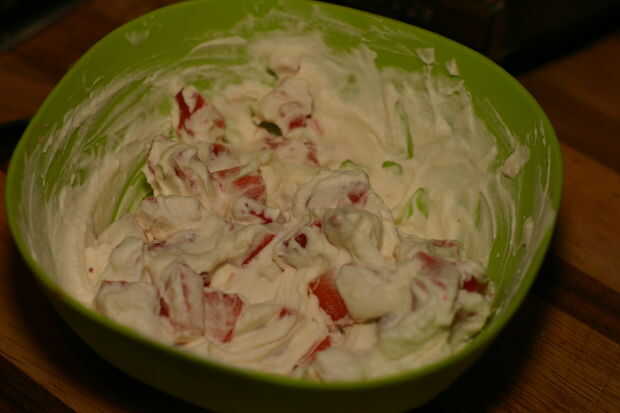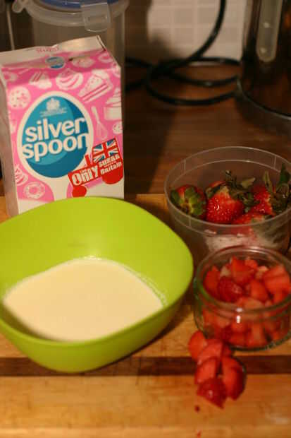 Ahora agregue las fresas con una cuchara o tenedor.