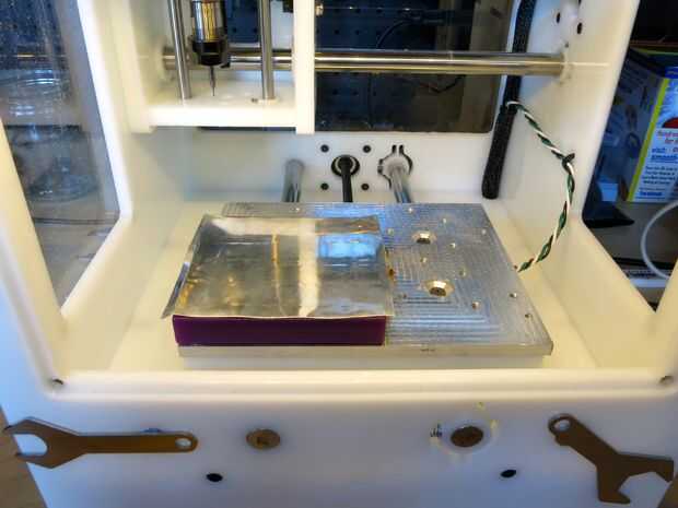 En Otherplan, seleccione la máquina > carga y descarga de Material. La cama de la máquina vendrá adelante así que puede fijar el material en él. Fije la parte inferior de la capa de sacrificio a la cama de la máquina con una gota o dos de pegamento caliente a lo largo de cada borde.