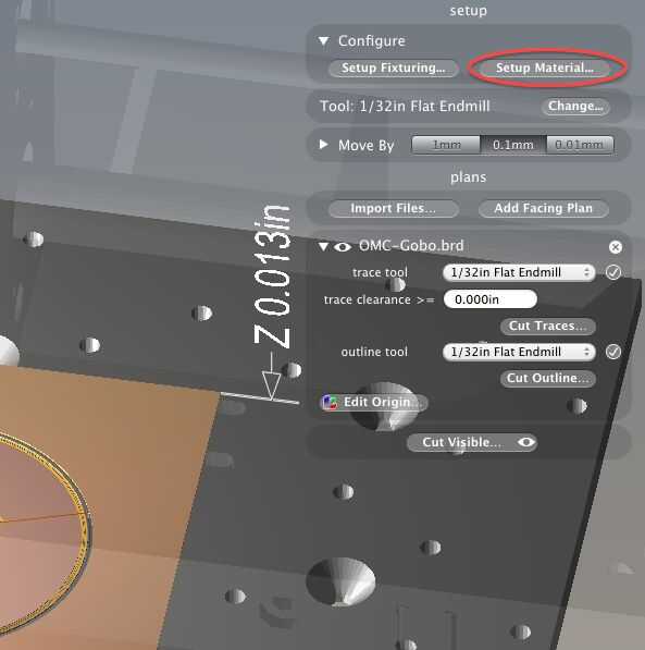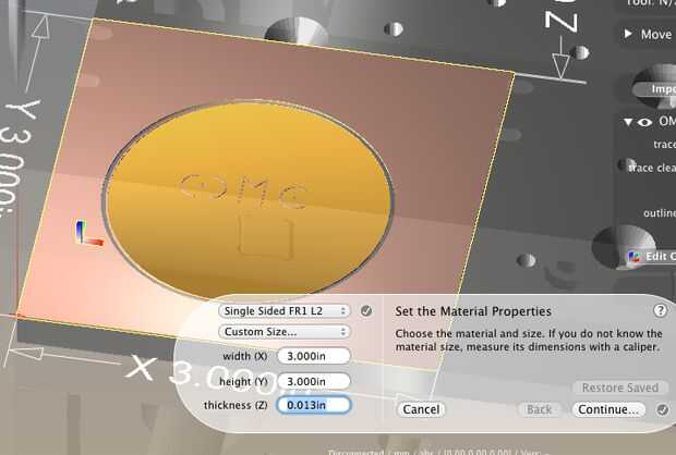 En el panel de configuración Material, seleccione una cara FR-1 como el material, seleccionar "Tamaño personalizado" y establecer las dimensiones para que coincida con el tamaño del material que está utilizando (en nuestro caso, 3 "x 3" x0.013 ").