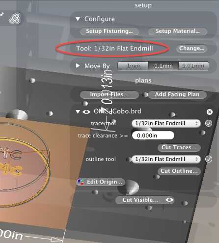En la ventana de planes, seleccionar el molino de punta plana de 1/32" como la herramienta de seguimiento y la herramienta contorno.
