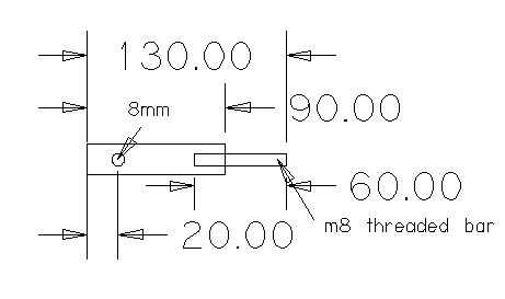 Los tensores están hechos con la tira de dos 20mm X 3mm 90mm largo con un agujero de 8mm perforado 20mm desde el extremo y 2 pedacitos largo de 60mm de barra roscada m8, soldar la varilla roscada a la banda para la longitud total es de 130mm. Acabo de doblar algunos tira y golpea ligeramente el agujero m8 pero creo que esta es una manera mejor.