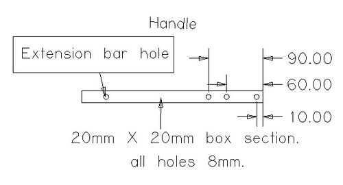 Es una longitud de sección en caja 20 X 20 mm y necesita aproximadamente 600mm de longitud sin embargo encontré que esto mucho es un dolor en las nalgas (bien las costillas en mi caso) y corta hasta 300 mm entonces utilice un tubo más grande como de 30 X 30 mm para deslizar sobre él para extender el mango. De esta manera usted puede eliminar la extensión cuando no esté en uso y no empalar a sí mismo en él.