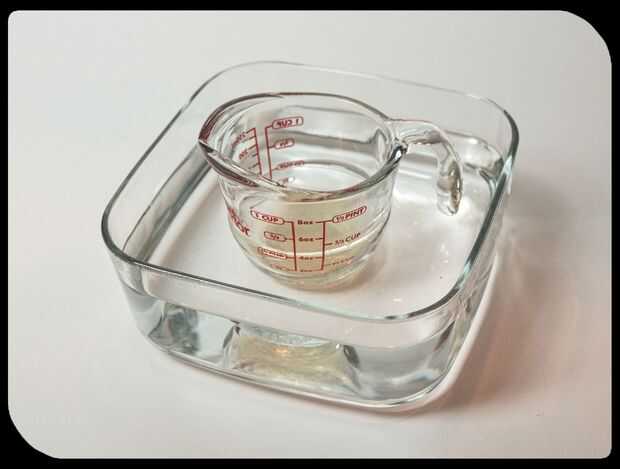 Después de 10 minutos, quitar las hojas de gelatina del agua y apretar suavemente. Ponerlas en media taza de agua y luego llenar el plato bajo tenías con agua caliente. El agua debe ser por lo menos 120 grados Fahrenheit, que es fácilmente obtenible de la mayoría de grifos. La taza de agua con las hojas de gelatina en el plato lleno de agua caliente y deja reposar durante 10 minutos.