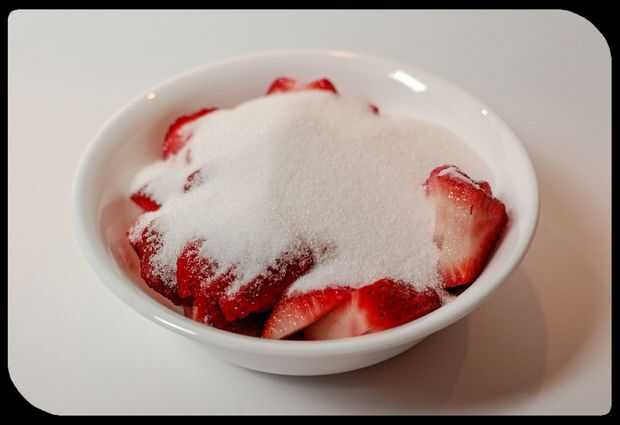 Cortar las hojas de gelatina en tiras de 1 pulgada y en agua fría durante 10 minutos. Uso gelatina de hoja porque es más clara, más sabor y más fácil de controlar que la gelatina en polvo. Añadir las fresas en rodajas a un cuenco con el azúcar y mezcle brevemente, a un lado.