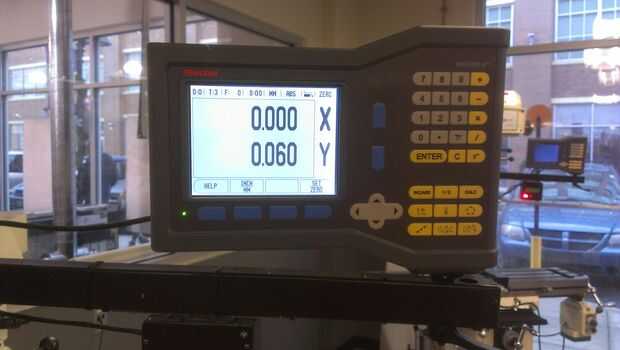La lectura digital salidas (DRO) en la última foto hacen de este un proceso muy fácil. Una vez encuentras el borde de una parte, si conoces las dimensiones del acero (en este caso, un eje de 1"), puede mover el eje del molino (recorrido delantero/al revés), en un 50% de la distancia y el eje en el molino será justo sobre el centro del eje.