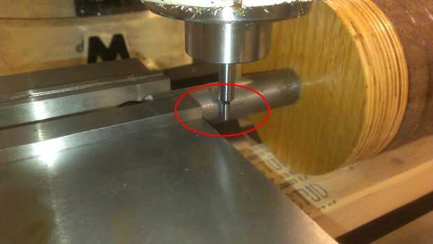 A continuación, utiliza un buscador de borde (el segundo círculo rojo) en el molino y ajustar el molino para que el buscador de borde había sólo echado un pelo, lo que indica el borde del eje del acero.