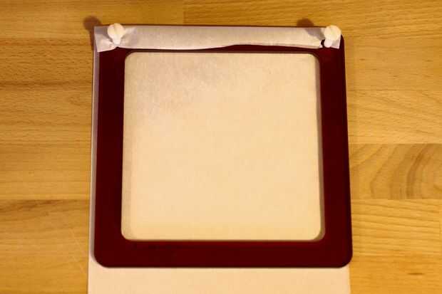 Como paso final, preparar la bandeja marco y desbordamiento. La estructura debe ser lugar sobre un pedazo de papel sulfurizado engrasado, y la bandeja debe ser forrada con papel sulfurizado engrasado.