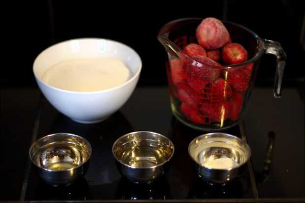He utilizado fresas congeladas, como no es temporada de fresas aquí todavía. Si utilizas fresas frescas, asegúrese de que usted les (cortar los pedacitos de base fibrosa desde el extremo del tallo de la baya) del casco. Si utiliza bayas congeladas, asegúrese de que están descongelados más o menos.