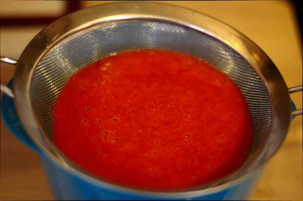 En este punto, puede colar el puré (o no) dependiendo de la textura final que desee en la capa de gelatina. Puré de filtrados dejan los pedacitos pulpos y las semillas en el puré, posiblemente dando por resultado una textura de "fruta-como" más. Quería mi jalea suave, así que dejé el puré hacia fuera.
