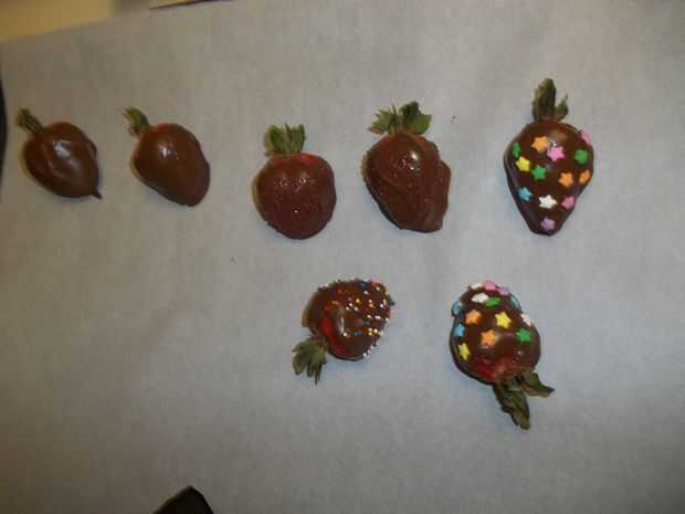 Inmersión de las fresas en el chocolate, cubriendo hasta el tallo. A continuación establece las fresas en pergamino. Añadir decoraciones de caramelo si lo prefiere. Tienda en el refrigerador hasta que esté frío y el chocolate se haya endurecido.