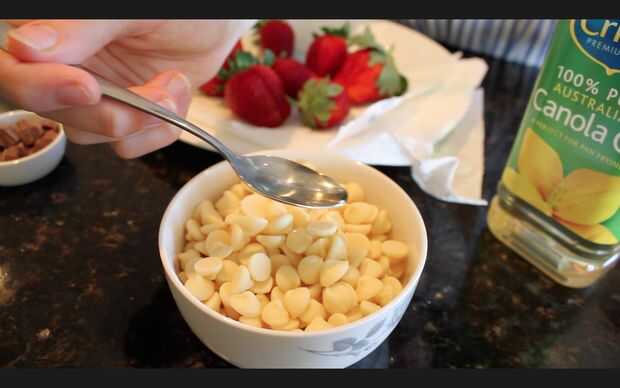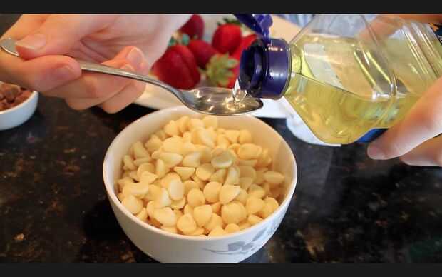 Estoy haciendo la forma rápida de derretir chocolate en el microondas. Puede derretir el chocolate en una olla de hervir el agua pero esto es rápido y siempre trabaja mejor para mí. Verter 1 cucharadita de aceite de canola sobre los blancos chocolates luego colocan en el microondas por 30 segundos en cerca de 80% energía máxima.