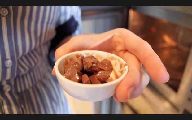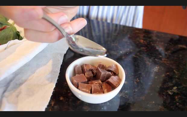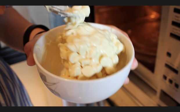 Tomar los trocitos de chocolate en el microondas y remover que se cerciora de que el calor se distribuye uniformemente aunque fuera el chocolate (a no ser derretidos en este momento pero no quiere quemar el chocolate por lo que tienes que hacer en pasos). Volver al microondas por 10 segundo más, el tomar la salida de chocolate y revolver. Repita estos 10 segundos de calentamiento hasta que el chocolate se haya derretido. Luego poner el chocolate blanco a un lado (resistir las ganas de mojar los dedos en él, pero nadie te juzgará si lo hace!)