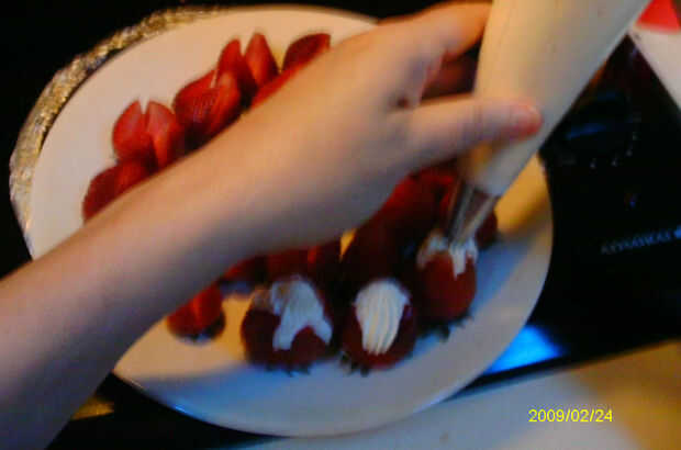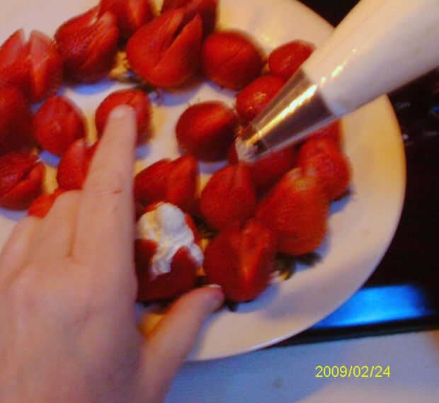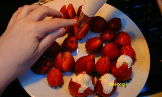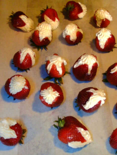 Pon las bayas rellenas en una charola o plato y les para enfriar hasta el momento de servir.