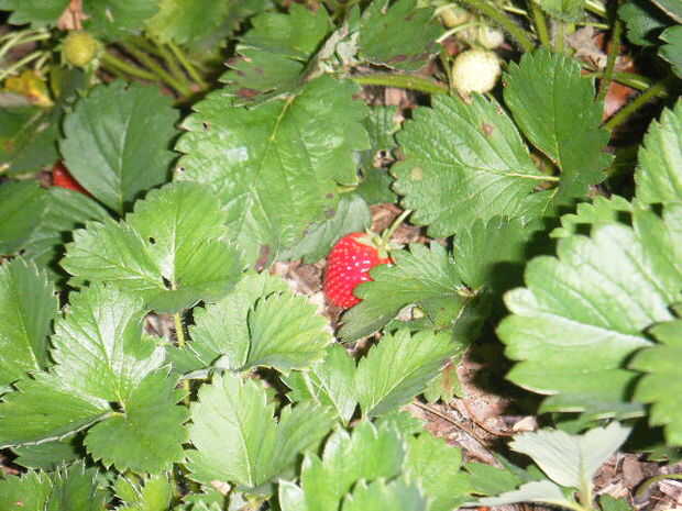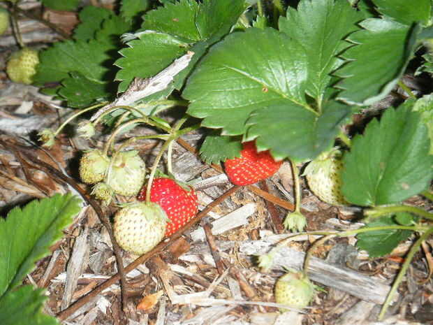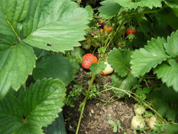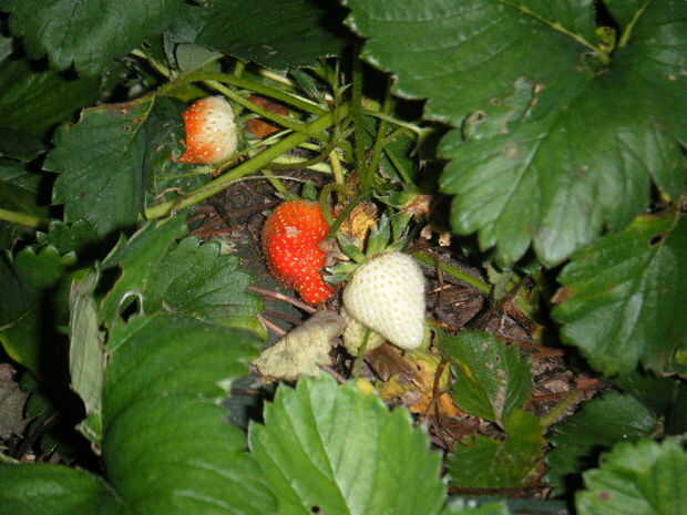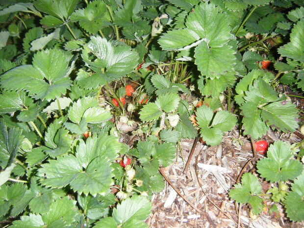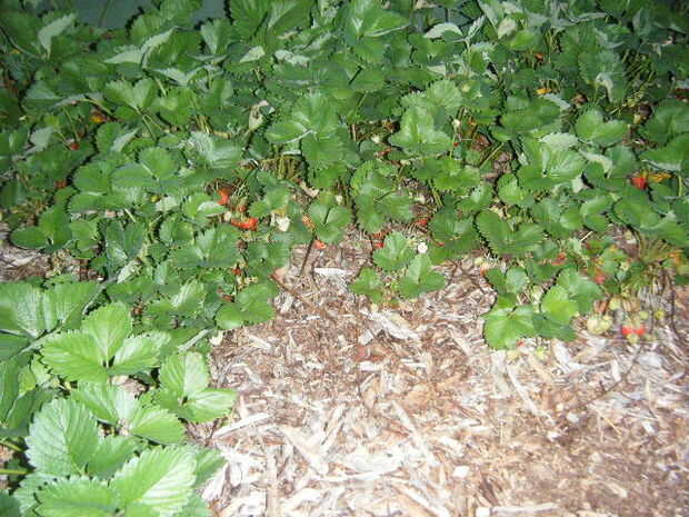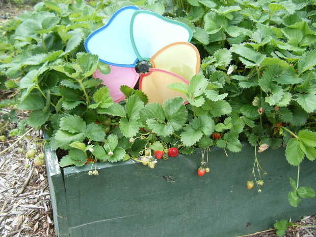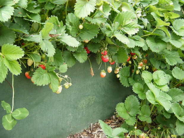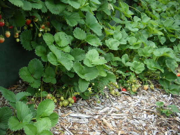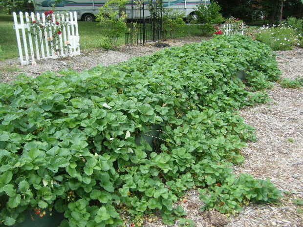 Hace aproximadamente un año, se construyó una jardinera de madera 2-tier y había pintado de verde. Entonces lleno de suciedad de estiércol de pollo y plantar algunas plantas de fresa. Ahora, un año más tarde, esto es lo que estamos obteniendo de las plantas.