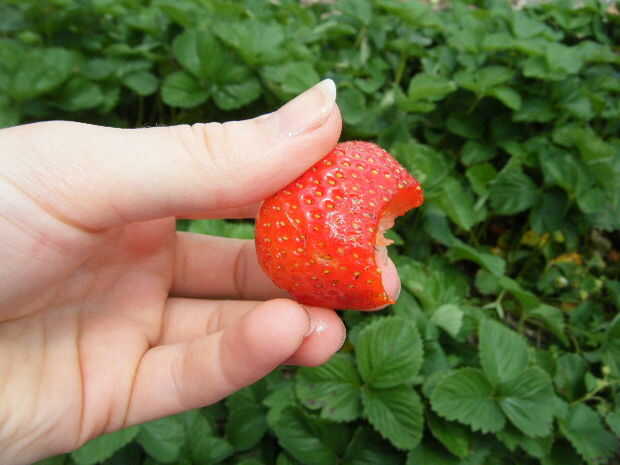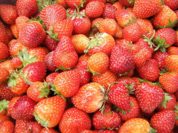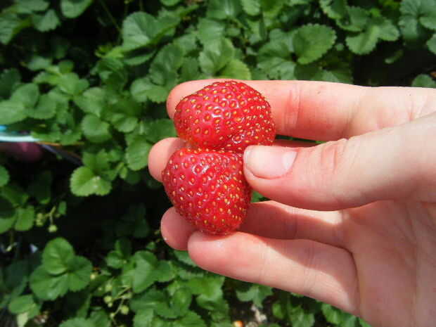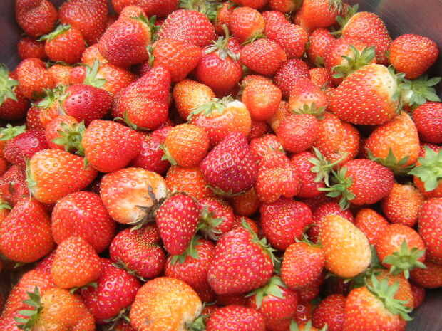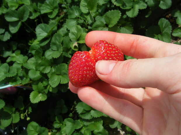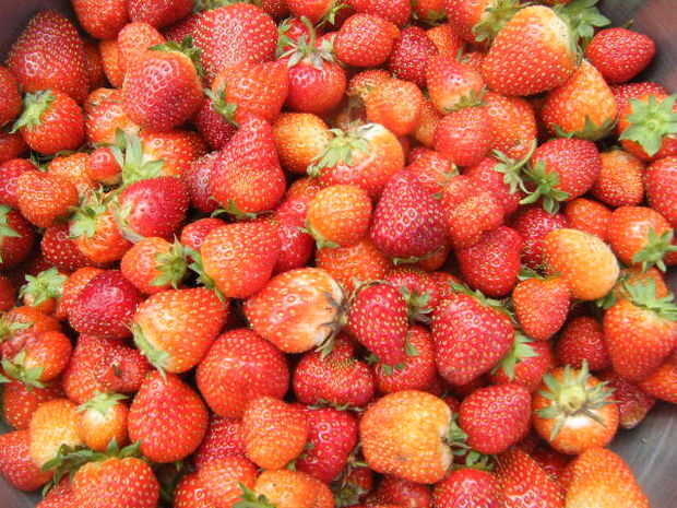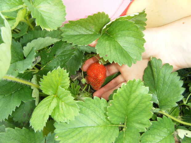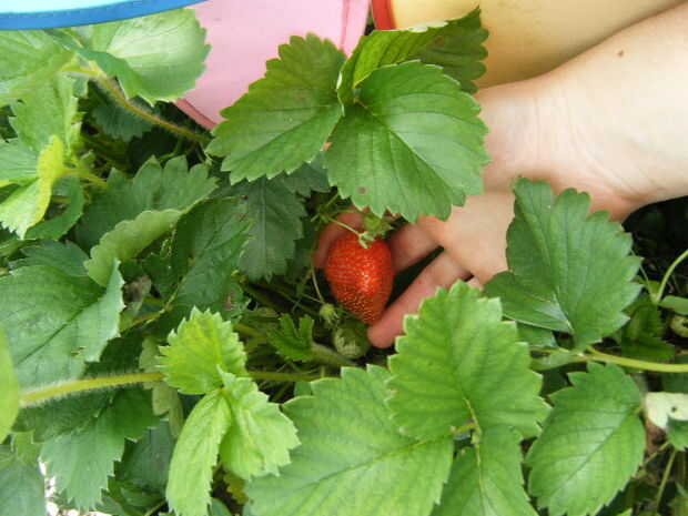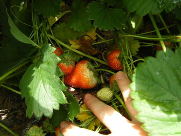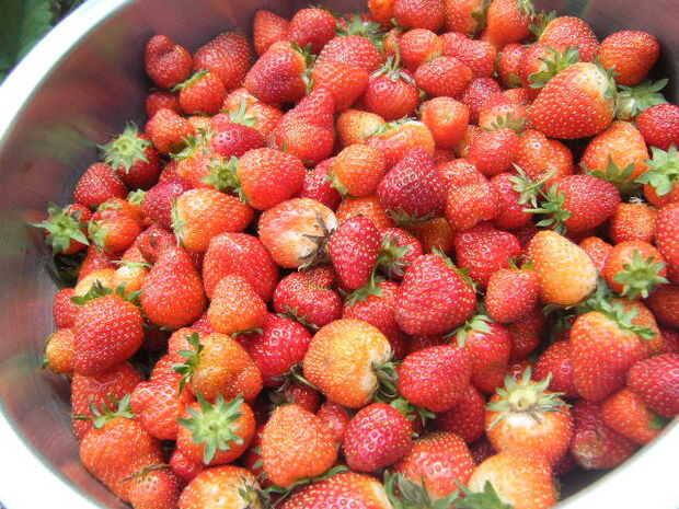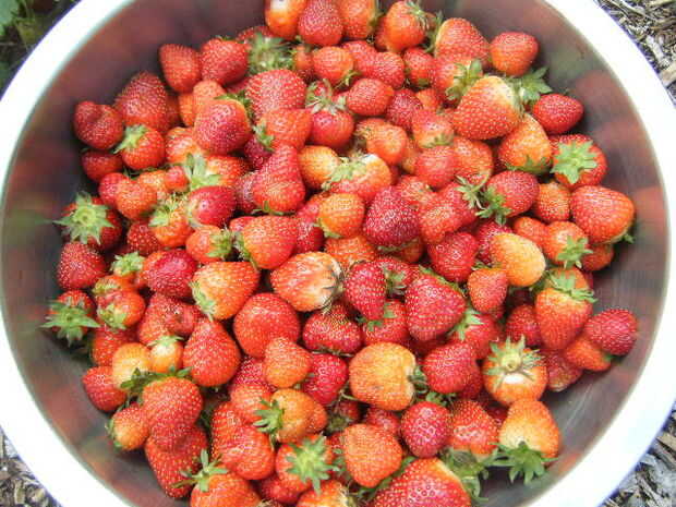 Hace aproximadamente un año, se construyó una jardinera de madera 2-tier y había pintado de verde. Entonces lleno de suciedad de estiércol de pollo y plantar algunas plantas de fresa. Ahora, un año más tarde, esto es lo que estamos obteniendo de las plantas.