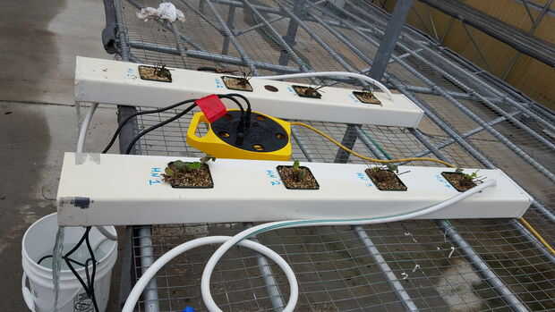 Ahora debe funcionar el sistema. Agua se bombea a través de la manguera y luego caerá de vuelta en el cubo en un ciclo continuo. Quizá deba añadir algo debajo de la bandeja para crear una pendiente para que el agua viaje al cubo.