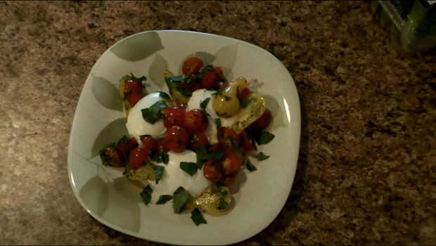 Verano pide una tradicional ensalada de tomate, mozzarella y albahaca. Con aceitunas verdes, corazones de alcachofa marinados y una substitución de oro tomates cherry, esta Ensalada caprese se desvía de la norma. Los colores frescos ofrecen una palet