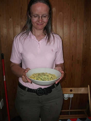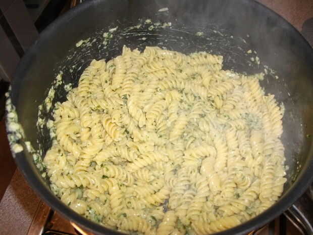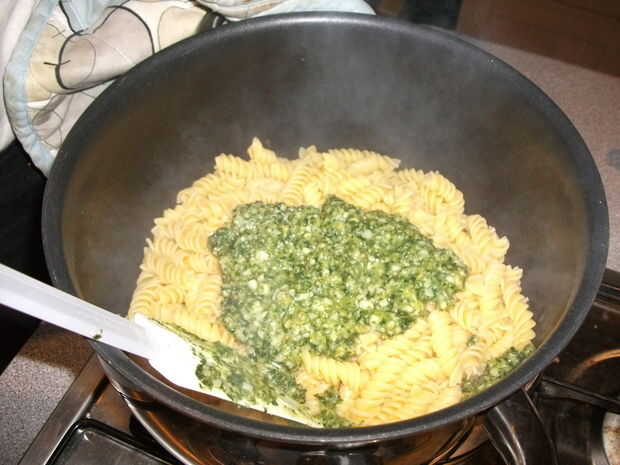 6 a 8 cucharadas de agua caliente de la cocción y revuelva en la salsa pesto. Escurrir la pasta, vuelta a la sartén y luego agregar el pesto hasta que la pasta está bien cubierta.