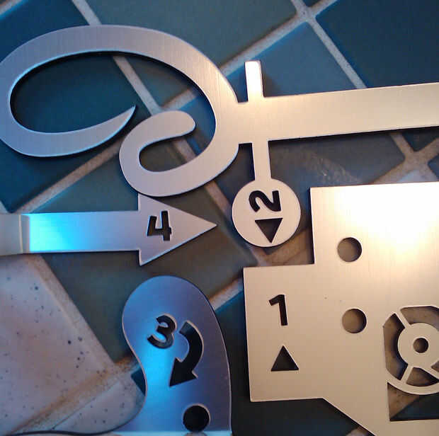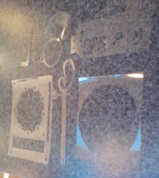 En la búsqueda de la web, encontré Pololu robótica y electrónica en Las Vegas, Nevada (pololu.com). Hacen un número de cosas realmente cool, incluyendo partes de venta para el tipo de proyectos aquí encontrado en Instructables. Mi contacto allí fue Arthur Rodrigues, que fue extremadamente útil. Después de un par de correos electrónicos y diseño de pequeño ajustes, corrió una prueba de corte en Mylar (piezas de la película transparente se muestra en la foto derecha inferior) para verificar la alineación de todo. Si está trabajando en un proyecto mecánico o un proyecto donde fit o tolerancia específica es un requisito, es bien vale la pena el tiempo y el menor gasto adicional que se ejecuta una prueba de Mylar corte. Mientras que el Mylar era demasiado delgado para demostrar que mi artículo funcionaría mecánicamente, probó que todos mis registro agujeros y ranuras iban a línea, así como de mi parte inferior ventana y engranaje firma de arte.