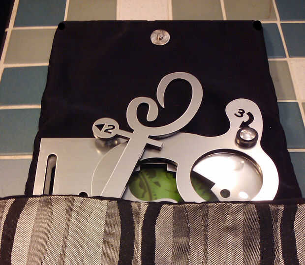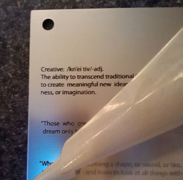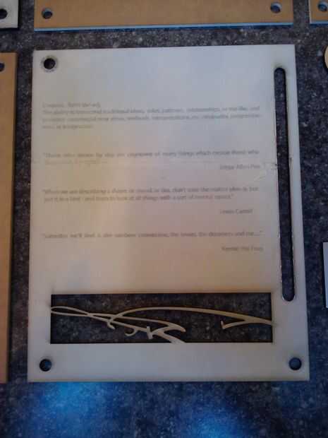 La parte posterior de mi caso incluye citas de laser grabado al agua fuerte sobre la creatividad y las guarniciones del hardware fueron seleccionadas para acentuar y llevar sobre los colores en el acrílico. Originalmente tenía la esperanza de encontrar un interesante paño letra pequeña para hacer una bolsa de presentación (tipo de envolvente si se quiere) para el caso y fue con la esperanza de ser capaz de reproducir el patrón en un archivo que puede ser grabado en la cara de la pieza superior de acrílico. No he podido encontrar al tipo de paño que estaba buscando, para que detalle cayó en la cuneta, pero coser un gran caso (gracias Barb!) para presentarlo en. Mi último detalle será encontrar un quemador de CD capaz de lite-escriba y quemar un patrón adecuado en la parte superior del CD para que al insertar en el caso, complementa y se suma a la apariencia general del proyecto.