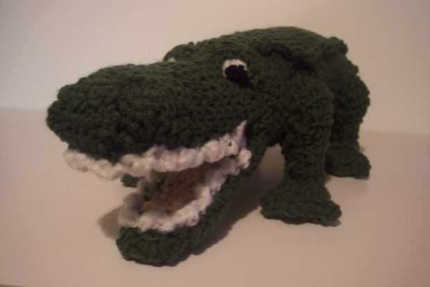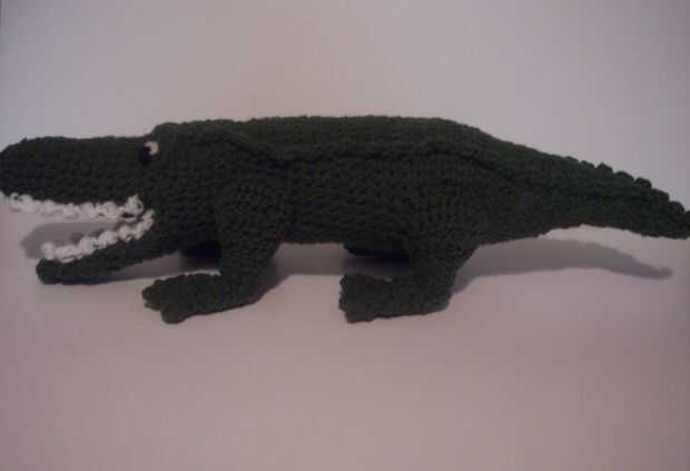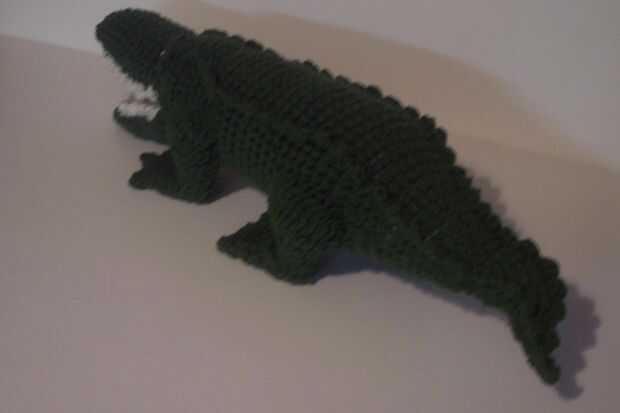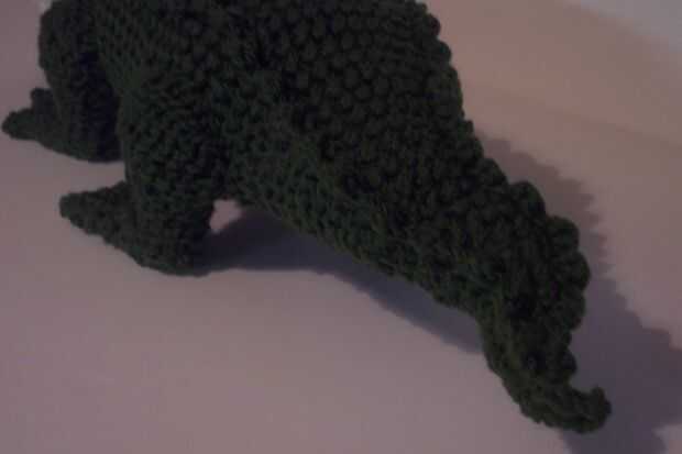 Me encanta animales con dientes grandes, y me decidí a hacer este chico después de estar dotado de una enorme pila de hilo verde. Este cocodrilo es mi propio diseño (ganchillo a mano alzada), y los dientes y crestas de hs se hicieron utilizando la misma técnica de la puntada. El cuerpo es una pieza de ganchillo transparente y las patas eran de ganchillo en por separado.