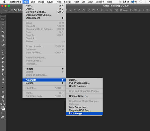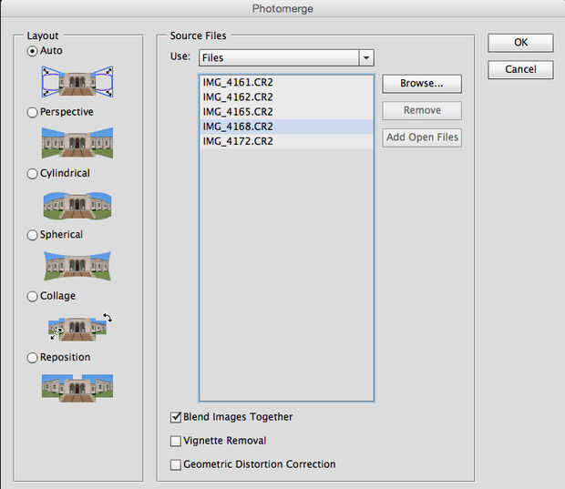 • En la ventana de Photomerge Marque "Auto" a la izquierda, que debe ser predeterminado, luego ir Browse y escoger tus imágenes. Pulse la tecla OK.