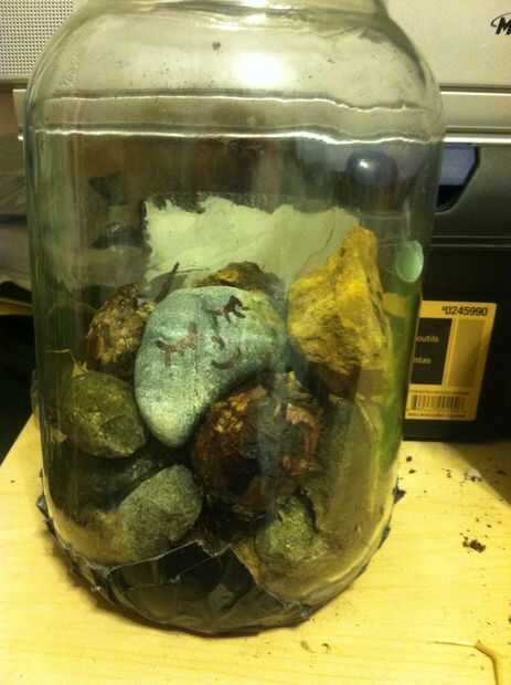 Paso 2:put las bombillas en el envase y cubrir dos o tres rocas en la parte superior