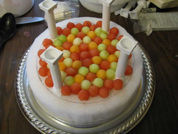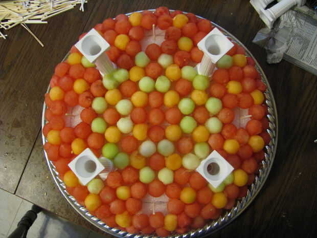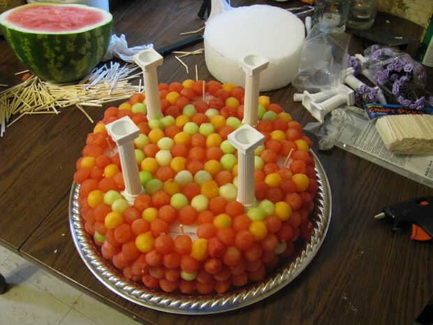 Paso 2: A partir del centro de tu primer nivel Inserte palitos y colocar la fruta en la parte superior en el patrón deseado, su forma en el borde y luego bajando por el lado de trabajo.