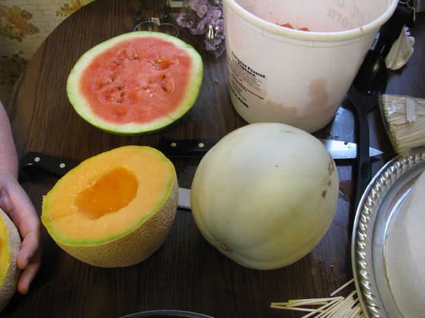 Paso 1: cortar melón, sandía y melón por la mitad y comenzar a todos melones de la bola