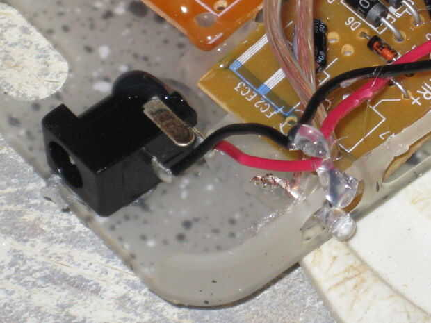 una vez hecho esto llevará indicador led azul y coloque la cabeza de él a través del orificio previamente hecho al lado de la toma, como se muestra,