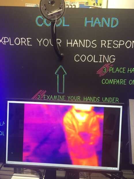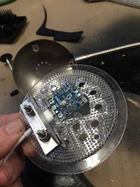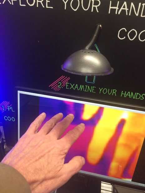 La cámara FLIR Lepton es una pieza disponible de hardware para el uso de los experimentadores. Proporciona una imagen de baja resolución del paisaje termal que es increíble! De repente te das cuenta de lo que una cantidad limitada de información es proporcionada por tales dispositivos anticuados como termómetros. Te das cuenta de que hay cientos de piezas de datos térmicos en la piel. Los sensores de IR utilizados en los termómetros de NeoPixel Resumen un gran cambio de área basado en un cono angular expansión pero el FLIR ve póngase en contacto con puntos de datos en tiempo real. Los datos fue difícil, actualmente hay algunos accesorios de FLIR para teléfonos inteligentes que no utilizamos porque hubiera tenido un tiempo difícil mantenerlas cargadas en la exposición. Elegimos un placa de E/S inteligente de lepton FLIR produce las imágenes de un cable USB a un ordenador que podría proyectarse en una pantalla HDMI para ver en pantalla grande. La unidad fue asegurada en un sándwich simple cuerda con ángulo de aluminio y colocada dentro de la carcasa de un LED de luz de la lectura con las agallas de quitar. Esto permitió a los participantes a que gire la cabeza en la voluntad y ver manos pies o cualquier otra cosa en la habitación sin poner en peligro la frágil electrónica.