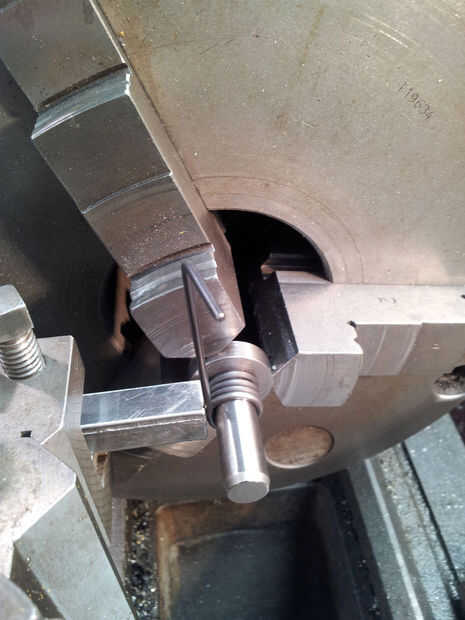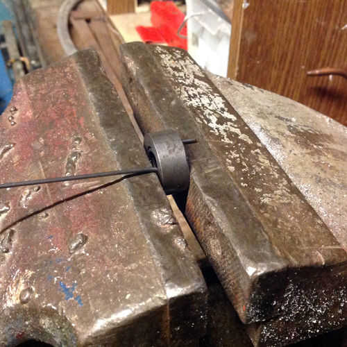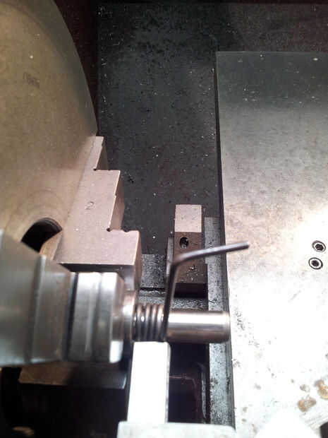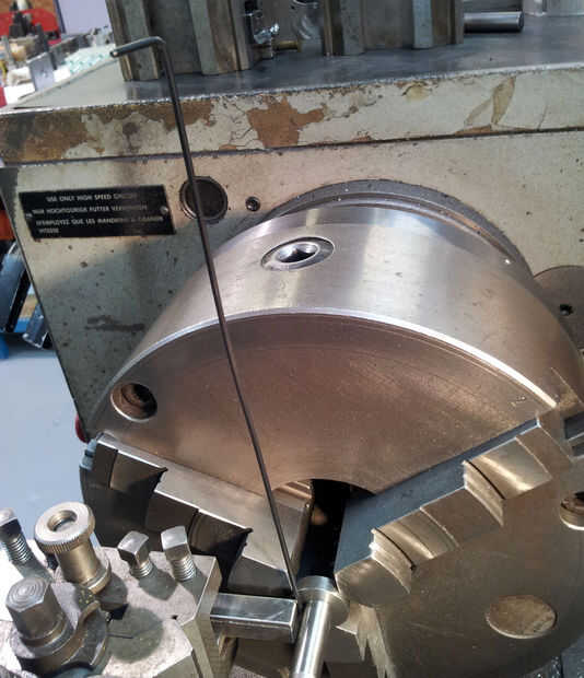 Lugar mandril de primavera en torneros Inserte el extremo doblado 10mm de alambre en el orificio de mandril para que el alambre está hacia arriba (ver foto), con la Plaza de la barra con un extremo plano en el poste de la herramienta hacia el alambre dejando un pequeño espacio para no atrapar el cable contra el mandril.