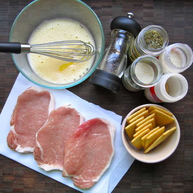 Usted puede ampliar esto realmente fácil! Tarda aproximadamente cuatro galletas para cubrir una chuleta de cerdo, y un huevo puede cubrir alrededor de cinco chuletas de cerdo. La clave es asegurarse añadir suficientes condimentos a las galletas.