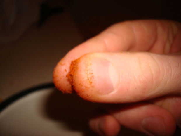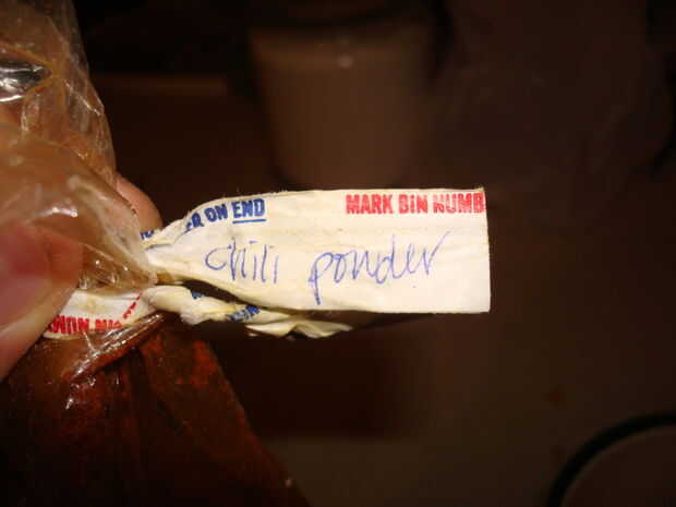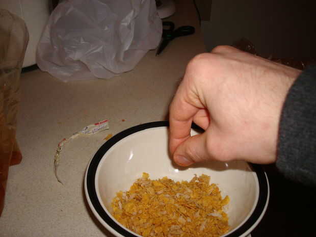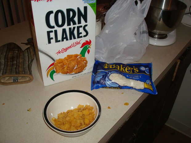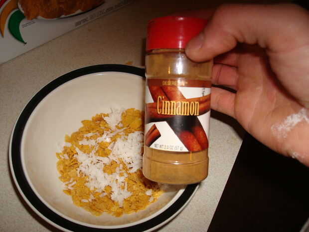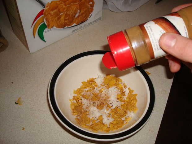 Coge un recipiente y llenarlo con sobre una taza de copos de maíz. Los triturados a mano, pero apuesto que funcionaría mucho mejor si se vierten en una bolsa y aplastar. Romper los copos en trozos pequeños, guardé unos cuantos impares para textura. Cuando hayas llegado a la consistencia deseada agregar otros ingredientes. Pongo en aproximadamente media taza desempaquetado coco, poner más si quieres. Luego sobre una cucharadita de canela, acabo de ir por la vista. Por último una pizca de polvo de Chile, esto le da un poco de picante.