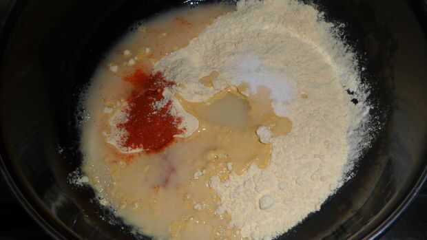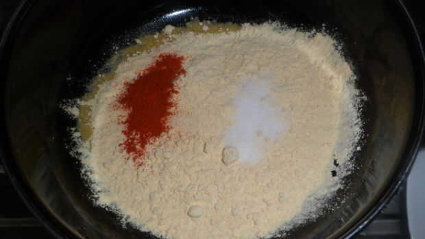 -Tomar gramos harina (harina de guisante del polluelo) en un bol. Añadir la mezcla, la sal y el polvo de chiles rojo.