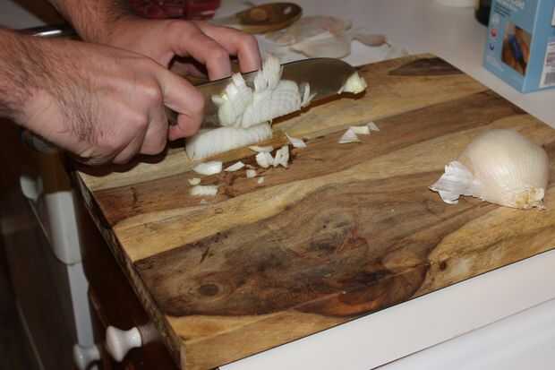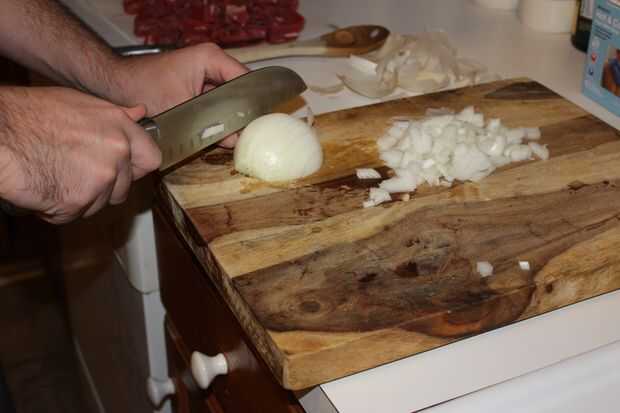 Vegetales (Instructable dentro un Instructable!!): Cómo picar una cebolla - picar la cebolla por la mitad desde las raíces hasta el brote. Retire las capas de papel hasta llegar a la cebolla carnosa. Usted puede cortar un poco de la porción de brote que tiende a tener un adicional algunas capas de la parte de papel (ver foto). Cortar la cebolla desde el brote de la raíz en incluso paralelas pero evite cortar completamente a través. Esto dejará la cebolla intacto mientras que se hacen todos los cortes transversales (se muestra en la foto). Debido a la anatomía de la cebolla, el segundo corte cubo de las capas de cebolla.