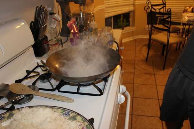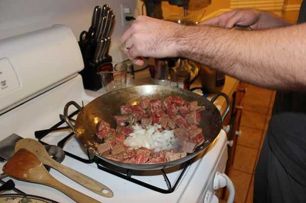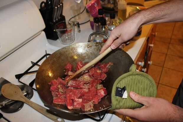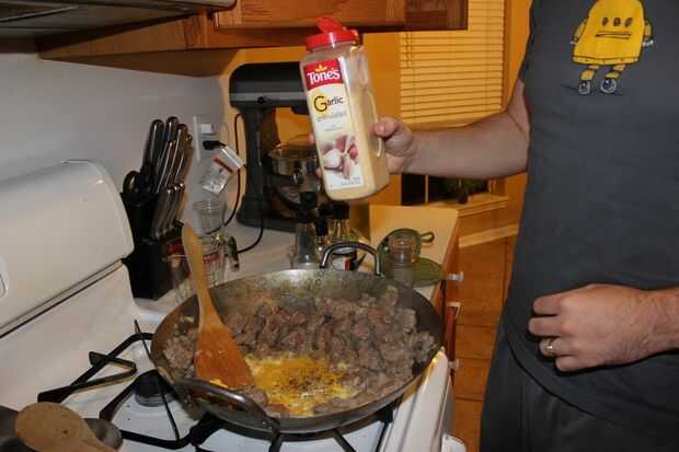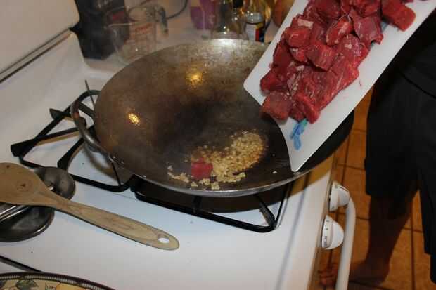 Marrón de la carne: Empiezo añadiendo aceite de oliva en la base de la sartén o wok. Woks están diseñados para uso con altas temperaturas. Más estufas de gas pueden alcanzar estándares mínimos de un Wok de calor. Aunque he tenido problemas con eléctrico. De todos modos. Espere a que el aceite de oliva a calentar bastante. Una vez caliente, pero no fumar, mezcle la cucharada colmada de ajo y luego agregar la carne en cubos.