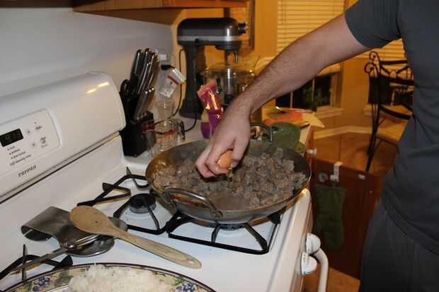 Añadir los huevos: De la misma manera que moviste la carne fuera del camino para las cebollas, hacia su mezcla el exterior de la olla para que el calor se concentra en el centro. Esto borrará un espacio para agregar los huevos. Romper los huevos y mezclar en el centro. Debe haber suficiente espacio que puede revolver los huevos sin llegar a gran parte de sus otras cosas mezcladas. Cocine hasta que bien revuelto. Asegúrese de eliminar cualquier shell que pudieran haber caído en la mezcla.